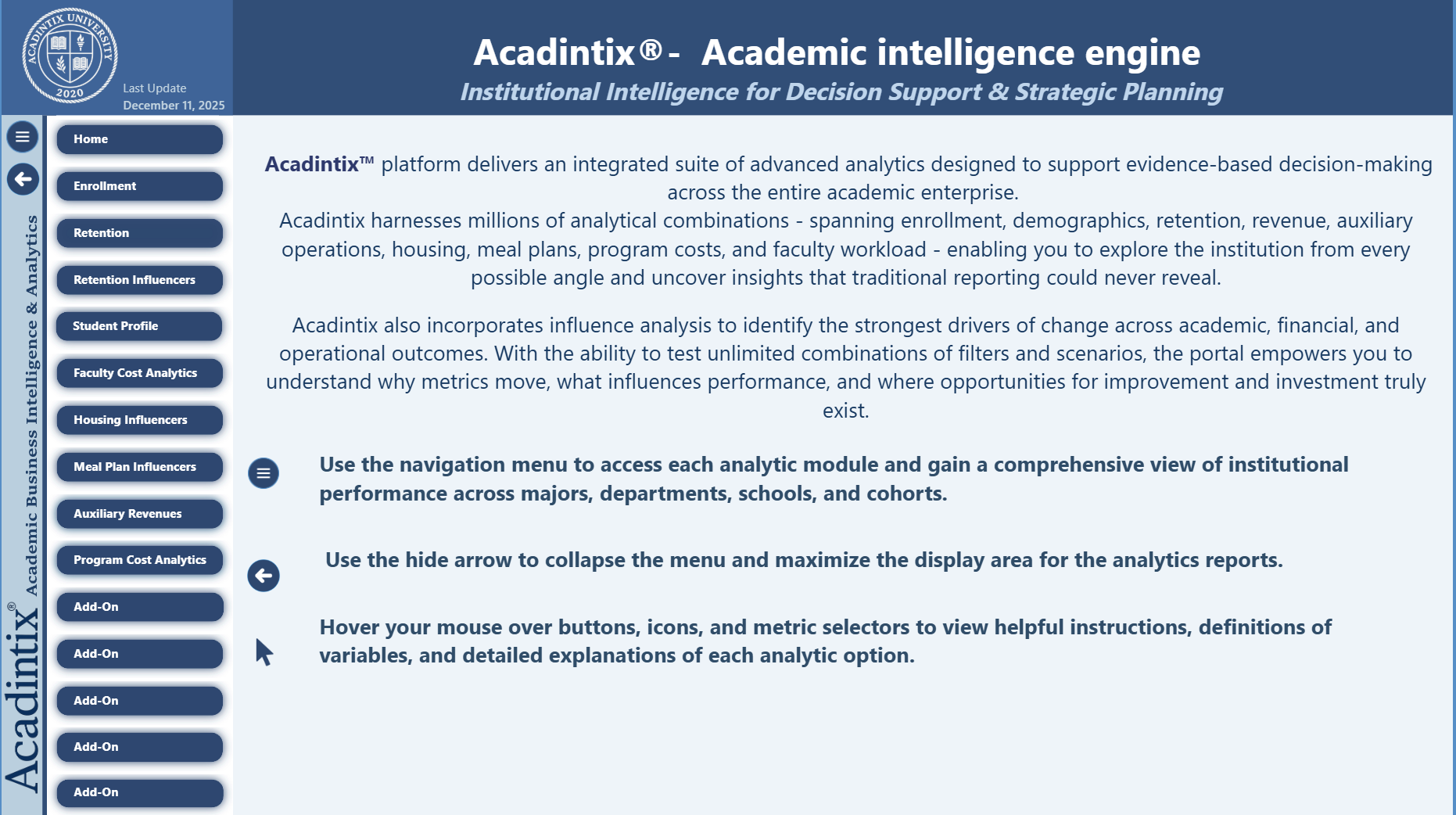 Together, these enterprise-grade systems form the backbone of every Acadintix offering-from budgeting tools to predictive enrollment modeling—executed entirely on-premises to guarantee data privacy, real-time responsiveness, and institutional control. With no reliance on third-party cloud platforms, Acadintix provides colleges and universities with a robust, cost-effective, and secure foundation for digital transformation in a dynamic higher education environment.